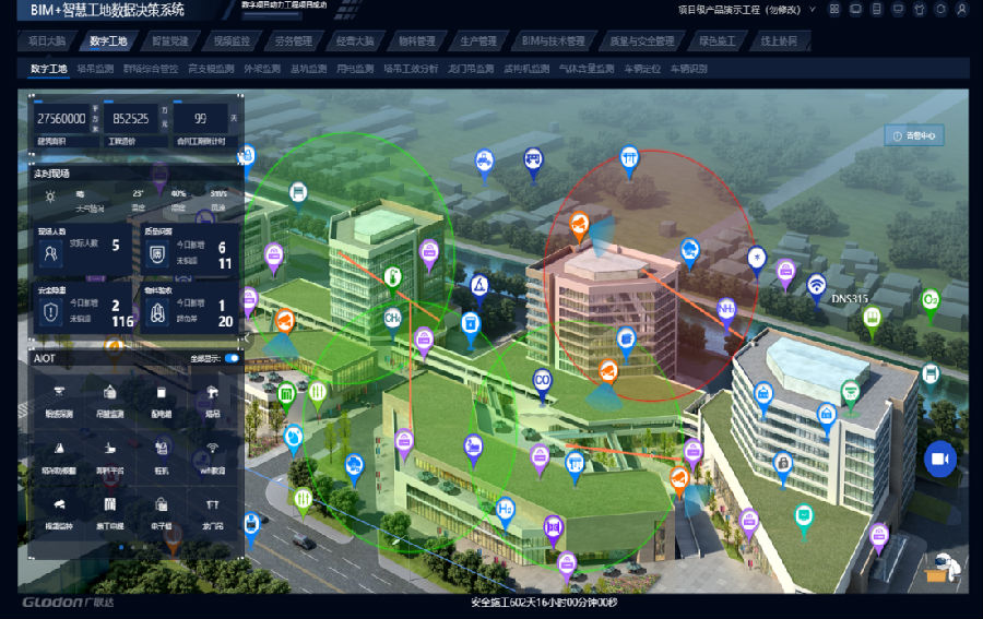 為積極響應“數字中國”理念,對傳統建筑施工進行數字化轉型升級,全方位應用智慧工地管理平臺,配備包括智能廣播、AI事件分析、塔機實時監測、智能安全帽、基坑監測、智能煙感、臨電箱監測、VR安全教育等10余項智能化管理模塊。通過“軟件+硬件”、“人防+技防+智防”實現對現場的動態智能化管控。