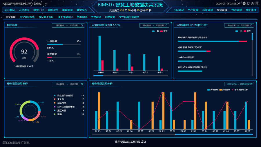 項目BIM管理平臺內置有各專業的2000余條風險庫,可按照風險等級標準化管控流程做對比分析,及時全面掌控風險分布狀況,自動生成隱患排查治理的單據及臺賬,全流程實時流轉至責任人,記錄留存、管理有痕、明確到人。危大工程資料、臺賬自動生成,現場視頻監控連入平臺,管理人員可遠程監控、掌握現場情況,圖紙變更管理、技術交底、方案管理等方面也可實現全覆蓋。目前,項目已獲兩項省部級以上工程建設BIM大賽“I”類應用成果。